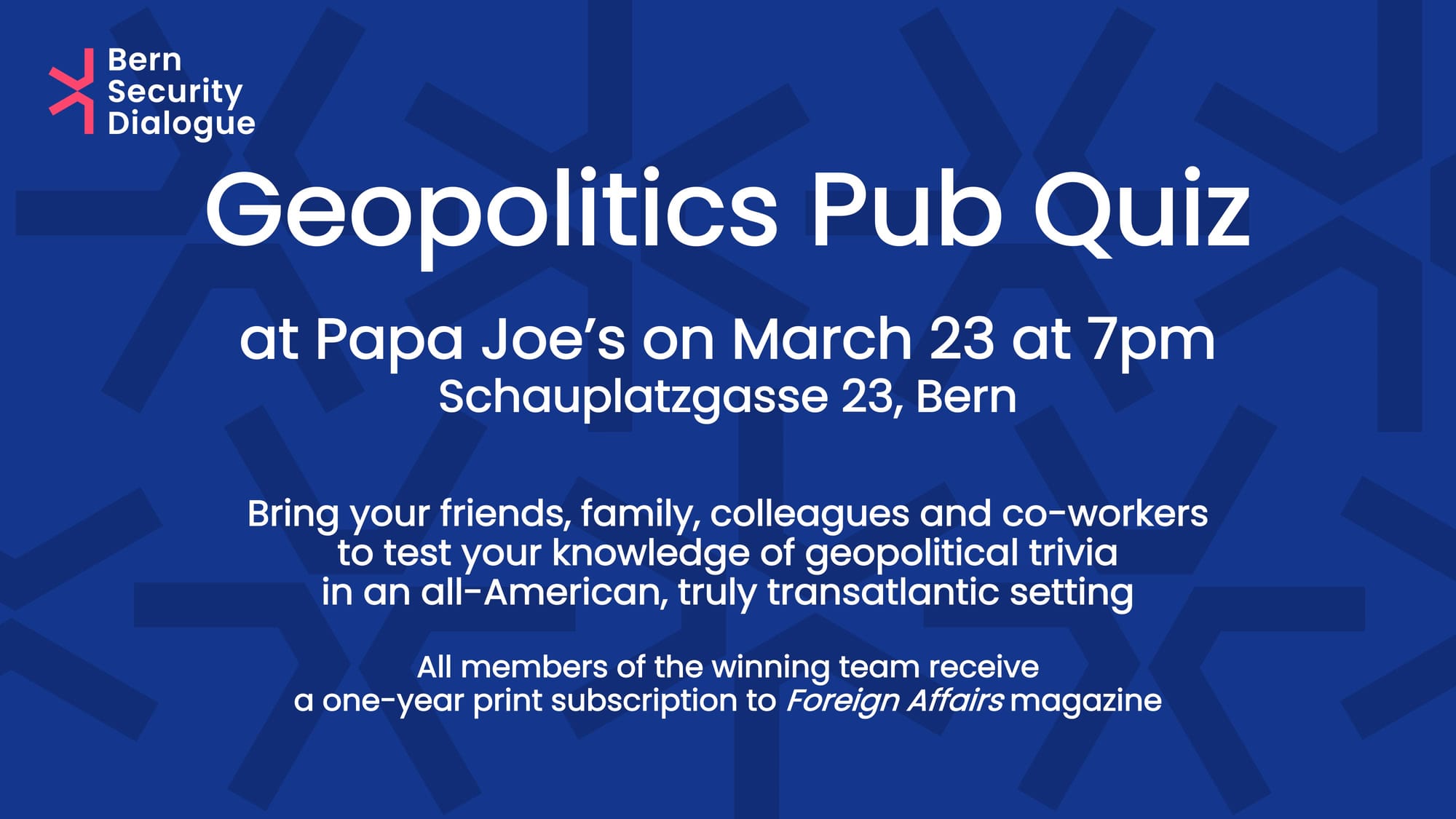 As a reminder, in ten days, the Bern Security Dialogue is kicking off its activities in Switzerland with a pub quiz at 7pm at Papa Joe's at Schauplatzgasse 23 in Bern. Come and test your knowledge in six key areas of geopolitics including military, political, diplomatic, cultural, historical and geographical trivia. Show us what you have got and participate for a chance to win an annual print subscription to Foreign Affairs.